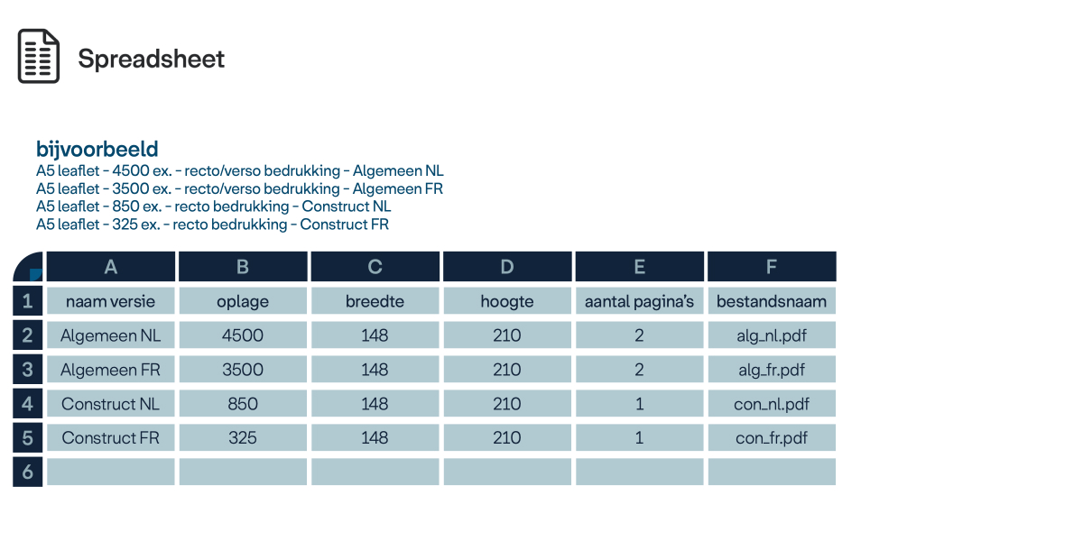 Wanneer je een drukwerk hebt dat uit meerdere versies bestaat, is het belangrijk dat de bestanden en gegevens duidelijk en gestructureerd worden aangeleverd. Daarvoor hebben we 2 type bestanden nodig; drukbestanden in PDF. en een spreadsheet met data.